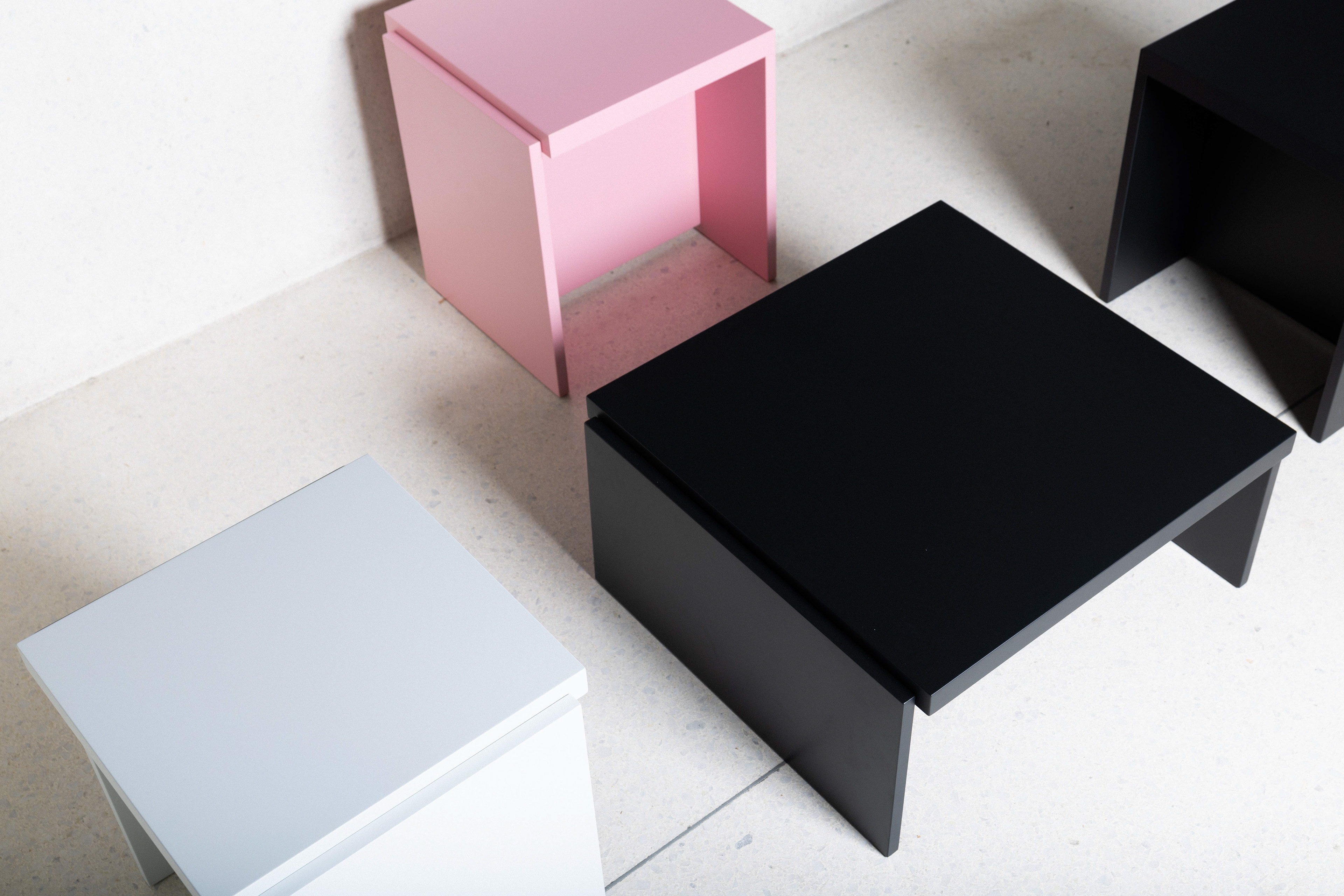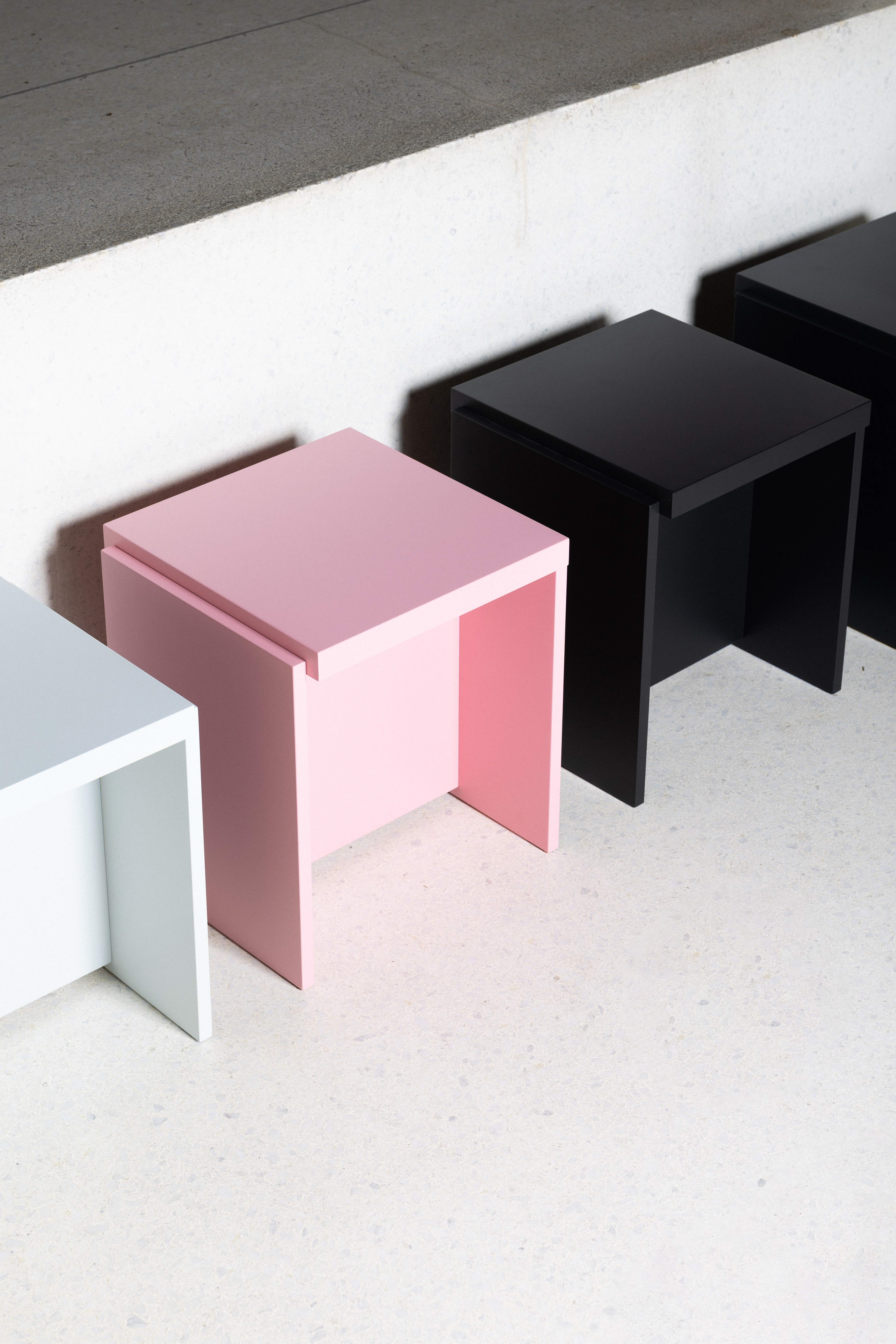 Collection of stools, bench and side table crafted from lacquered MDF brings a fresh balance of simplicity and versatility. With bold colors and refined surfaces, each piece adds a contemporary accent to both private and public spaces. The collection is designed for flexible arrangements — perfect for spontaneous gatherings, creative workspaces, or cozy corners at home.